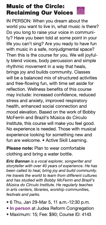 Testimony: “We really enjoyed Eric’s workshop! Our group bonded through music and movement in a way that we hadn’t before. We experienced so much delight and joy. Eric was able to accommodate one of our members with mobility issues, which I appreciated. I highly recommend Eric’s workshops” – Rev. Melissa Sparks